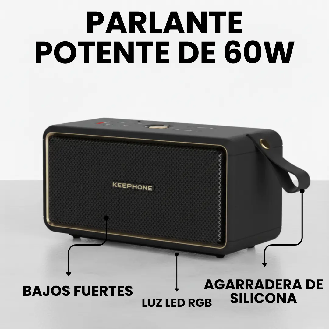 Parlante Bluetooth Keephone MusicPod Pro de 60W con sonido potente, bajos profundos, Bluetooth 5.3, luces RGB y batería recargable. Ideal para llevar a cualquier lugar.