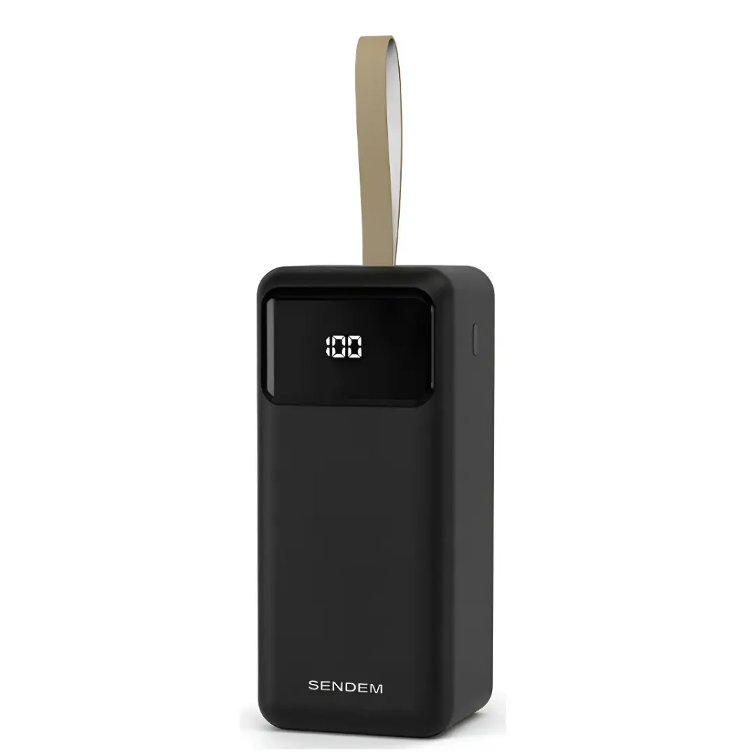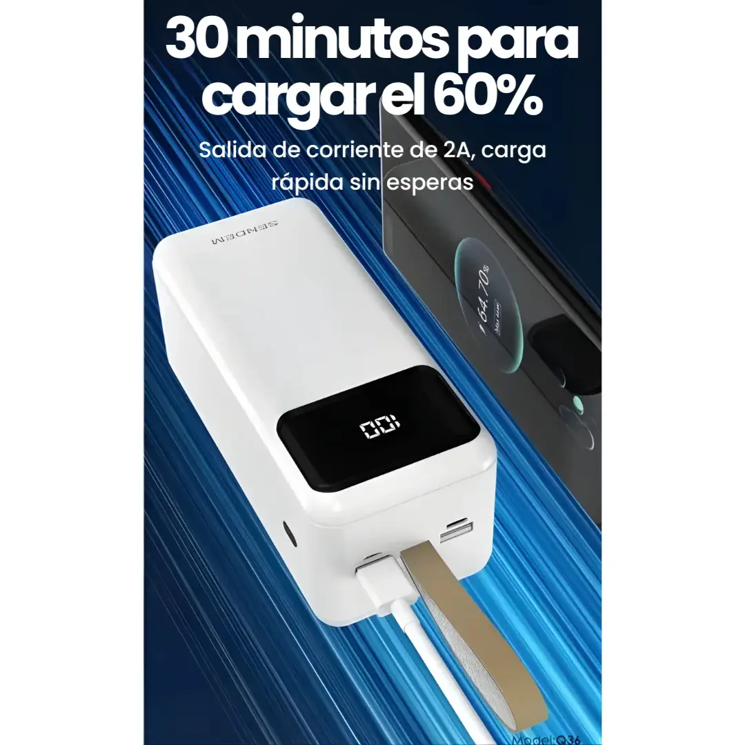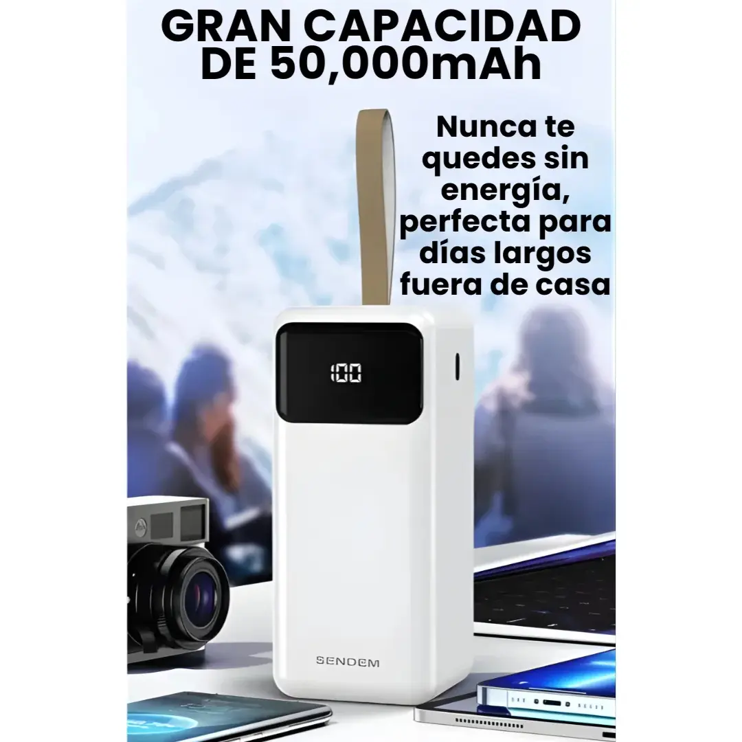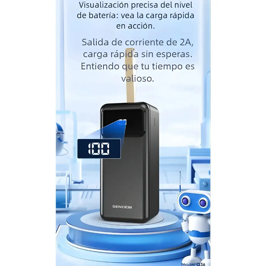 Mantente con energía durante todo el día (e incluso varios días) con la Powerbank Sendem Q36 de 50000mAh, una batería portátil de alta capacidad, ideal para viajes largos, trabajo, estudio, camping o cualquier situación donde necesites carga continua y confiable.