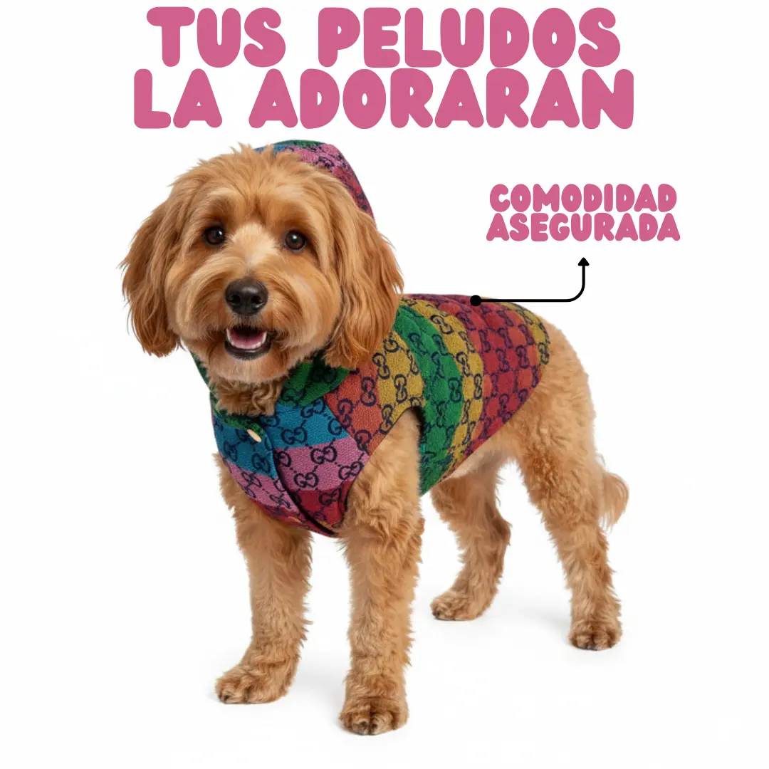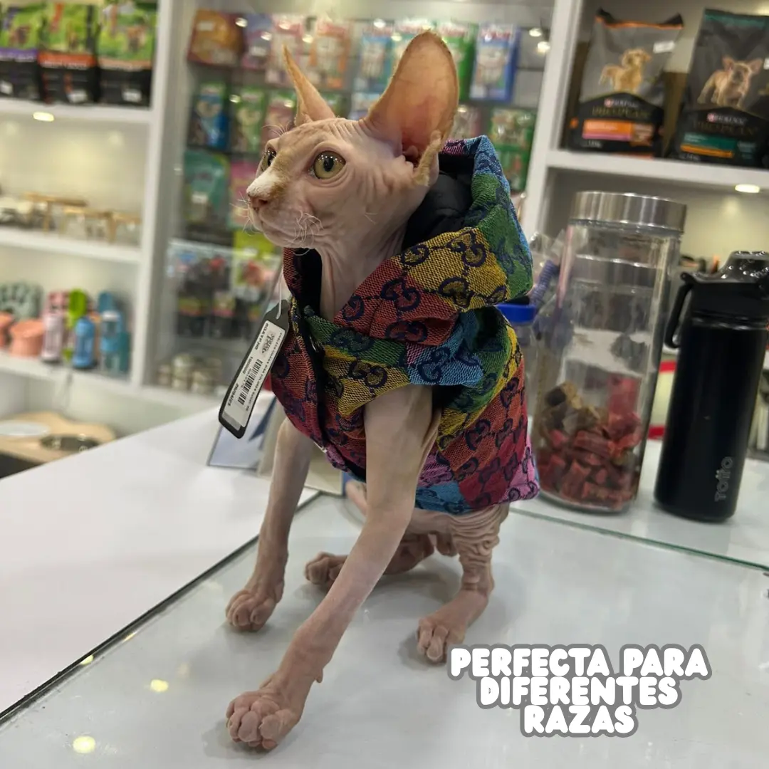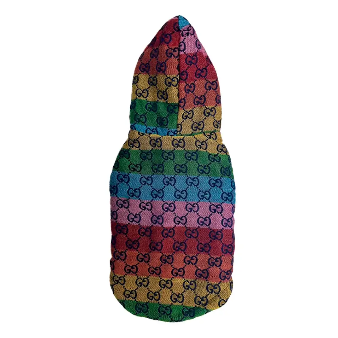 El chaleco con capucha para perro o gato con estampado tipo Gucci multicolor es la prenda perfecta para quienes buscan ropa para mascotas moderna, llamativa y cómoda. Su diseño arcoíris aporta un estilo único y elegante, ideal para destacar en paseos, salidas o sesiones de fotos.