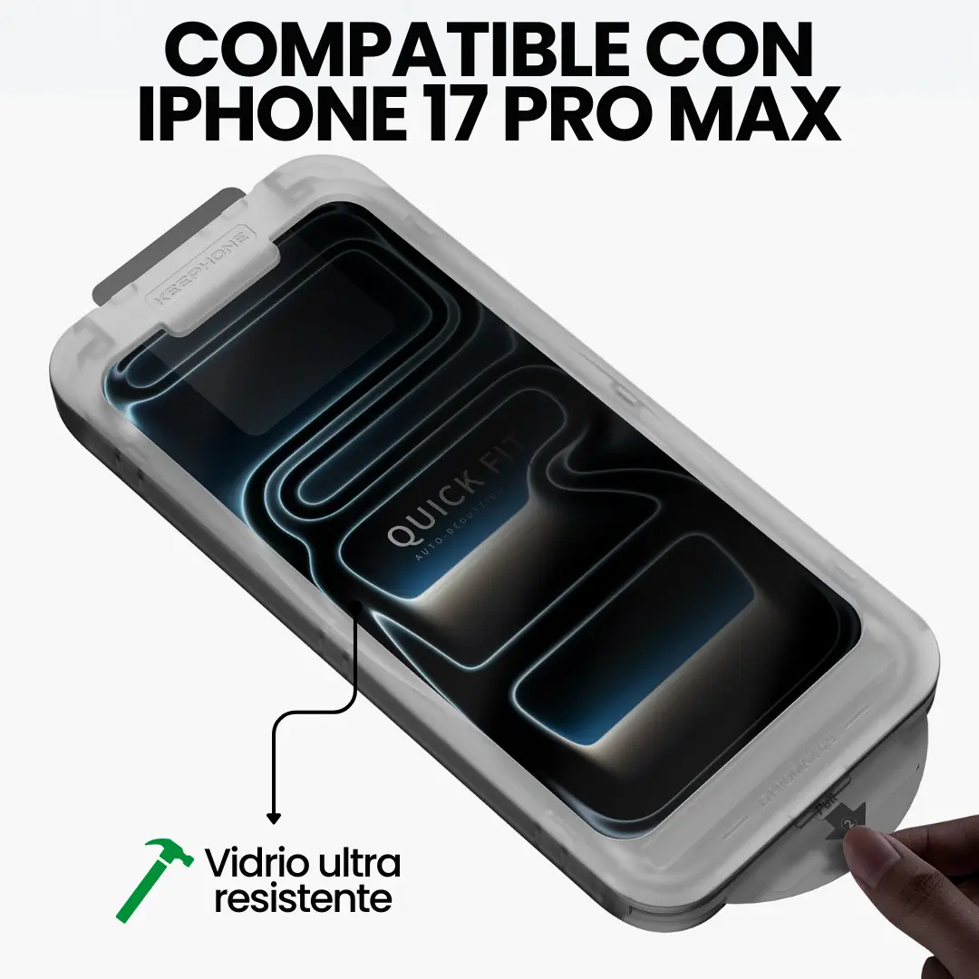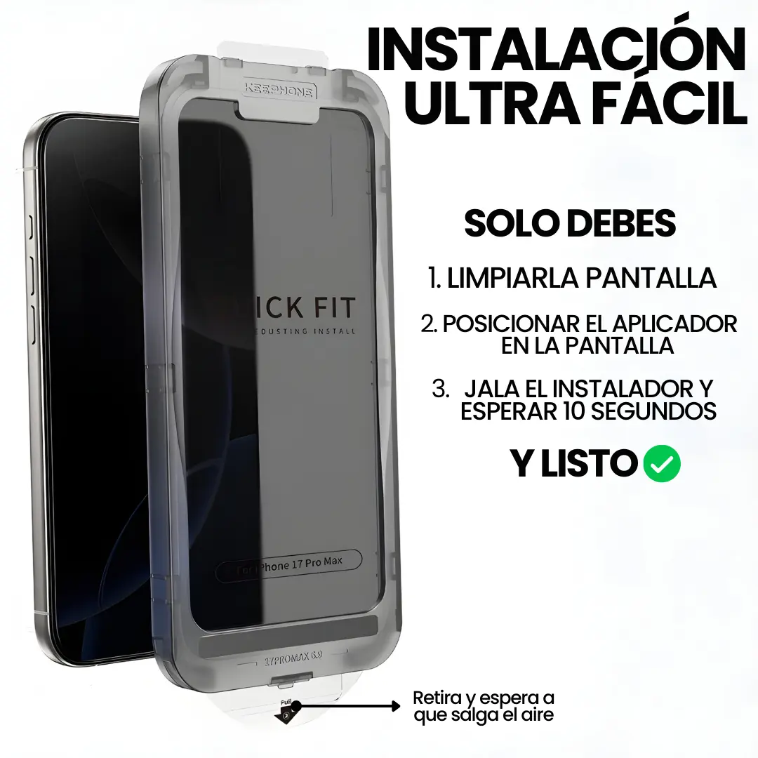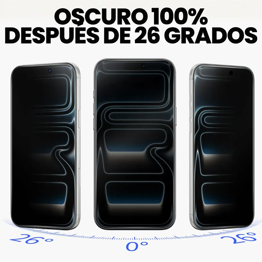 Vidrio templado antiespía 9H para iPhone 17 Pro Max. Protección ultra resistente, privacidad 26°, instalación fácil sin burbujas y alta sensibilidad táctil.